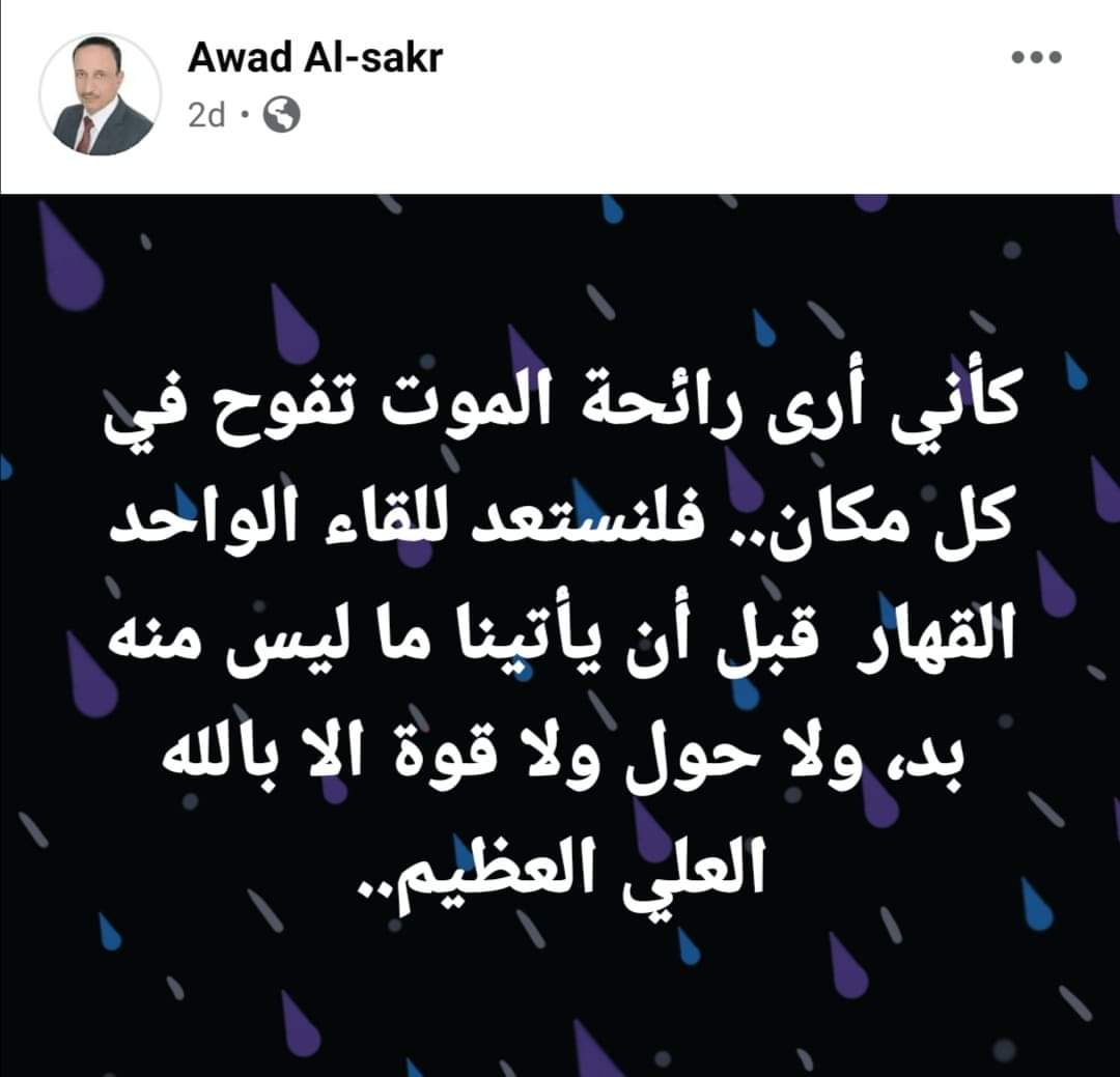 واضاف في منشور له على صفحته الشخصية فيس بوك : "فلنستعد للقاء الواحد القهار قبل ان ياتينا ما ليس من بد ولا حول ولاقوة الا بالله العلي العظيم"