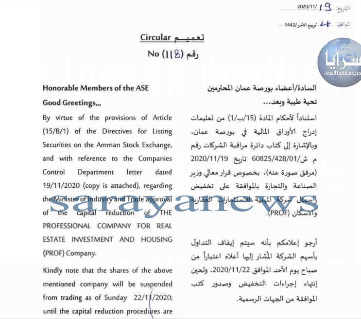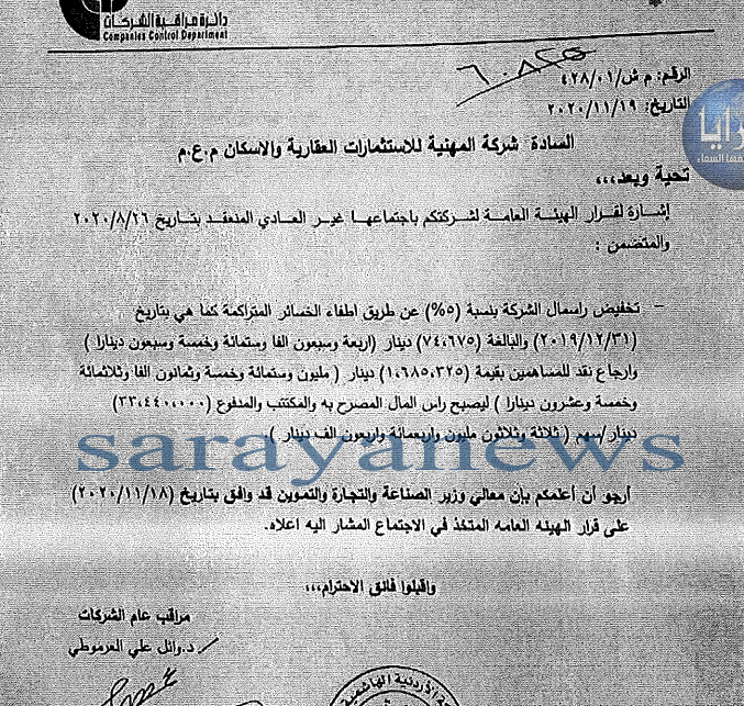 وجاء في الكتاب الذي وصل سرايا ان الهيئة العامة قررت تخفيض رأس مال الشركة بنسبة 5%، وفقا للاجتماع غير العادي المنعقد بتاريخ 26/8/2020، وذلك لإطفاء الخسائر المتراكمة والبالغة 74.675 دينار و ارجاع نقداً للمساهمين 1.685.325 ليصبح رأس المال المصرح به والمكتتب والمدفوع بقيمة 33.440.000 دينار/سهم.