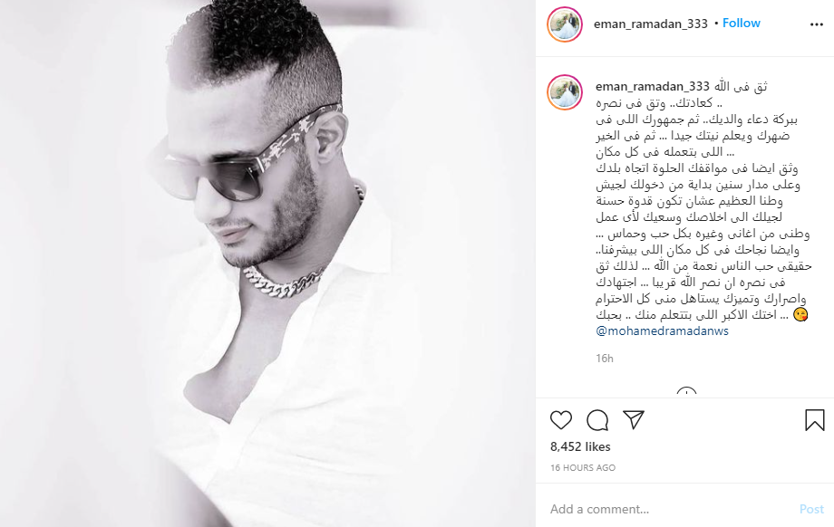 ولهذا نشرت على حسابها الخاص على تطبيق "إنستغرام" صورة له ووجهت إليه من خلال التعليق رسالة كتبت فيها: "ثق في الله كعادتك. وثق في نصره، ببركة دعاء والديك ثم جمهورك اللي في ضهرك ويعلم نيتك جيداً ثم في الخير اللي بتعمله في كل مكان".