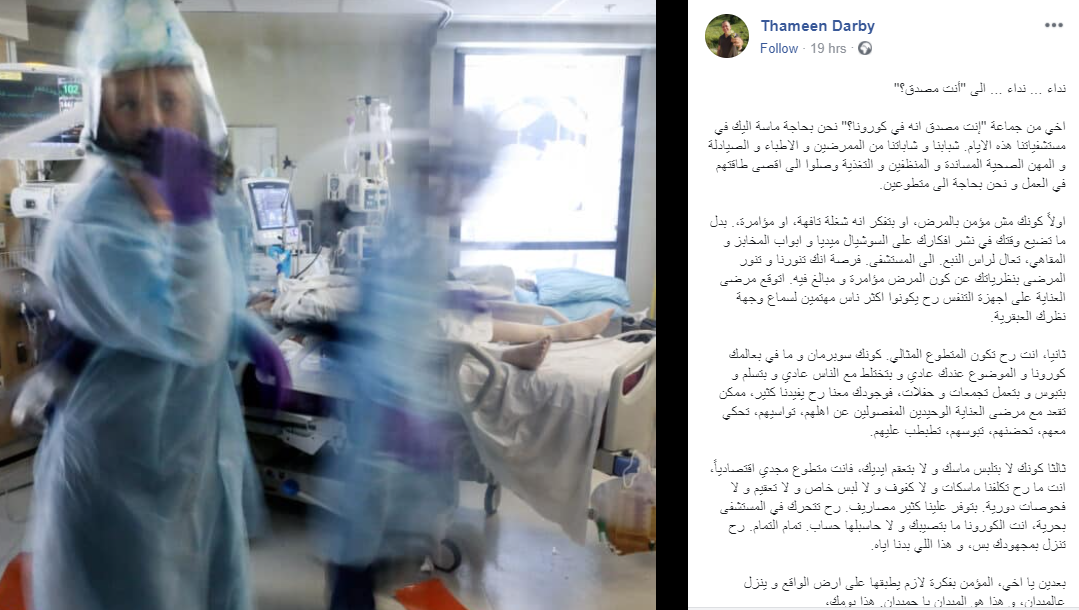 المستشفى مليان ناس من المضحوك عليهم بفكرة انه في كورونا و قاعدين يا حرام بشتغلو ا ليل نهار على الفاضي، و في ناس كثير في المستشفى عم بمرضوا و بدخلوا العناية المركزة و مصدقين انه مرضهم من الكورونا. و في كثير اهالي بنتظروا امام ثلاجة الموتى ليشوفوا اهلهم من بعيد و هم مفكرين انهم ماتوا من الكورونا. آن الاوان ان تتحرك يا صديقي و تفهِّم هدول الناس كلهم غلطهم و توعيهم.