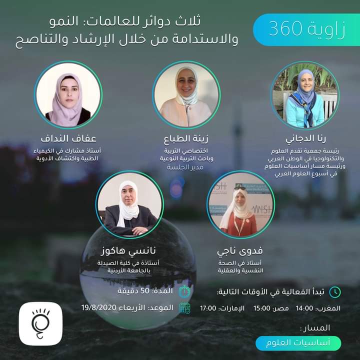حيث دار الحوار عن أهمية النصح والارشاد من وجهة نظر المرشد والشخص الذي يتم ارشاده في جميع مجالات الحياة سواء على المستوى الشخصي والأجتماعي والمهني. حيث شكلت تجربة ثلاث دوائر للعالمات أنموذج سهل التطبيق في النصح والتوجيه والذي دار بين عالمات من مختلف الاختصاصات ومختلف الاماكن (المستوى المحلي والاقليمي والعالمي). وما يميز هذا الانموذج هو سهولة تطبيقه ليس فقط في الجامعات وانما في شتى القطاعات وعلى مختلف المستويات. حيث ان ادخال التناصح (mentoring) يسهم بشكل فعال على تنمية مهارات التفكير, حل المشاكل , الاتصال والتواصل , والبحث عن التعلم المستمر بما يضمن تطور الفرد والمؤسسة والمجتمع. وقد تم بث هذه الحوارية بشكل مباشر عبر الفيس بوك وتابعه علماء من جميع انحاء الوطن العربي. وفي نهاية اللقاءابدى الحضور اعجابهم بهذا الانموذج و توجهوا بالشكر الجزيل للمحاضرين على اثراء الحوار من خلال طرح التجارب الشخصية لهم