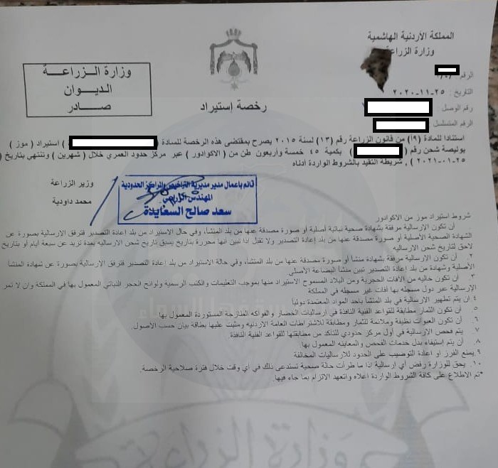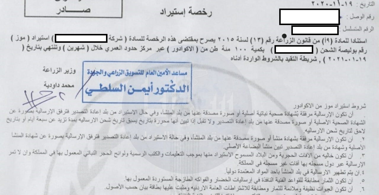 و أضاف علاء العدوان عضو جمعية مزارعي ومنتجي الموز لسرايا ان اعضاء الجمعية اجتمعت مع الوزير بتاريخ 29/11/2020 للاستفسار عن منح رخص استيراد لبعض الشركات، و تم عقد اجتماع مع وزير الزراعة وعدد من أعضاء الجمعية، وعند السؤال عن منح رخص استيراد مادة الموز من الحدود البرية عن طريق حدود العمري ، أجاب مساعد الأمين العام للتسويق و اعترف بذلك امام الحضور وامام الوزير داودية، علما بأن هذا الفعل مخالف لقرار الوزير بوقف الاستيراد من 25/10/2020 ، و قد تم ادخال كميات كبيرة اغرقت السوق الاردني، وفق العدوان.