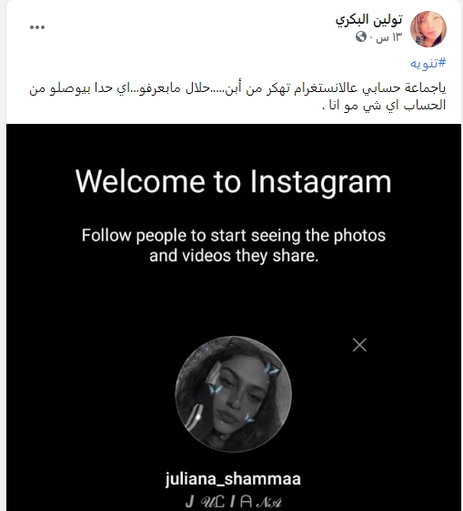 تولين البكري تعلن تهكير حسابها الشخصي على انستجرام