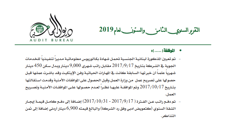 سرايا - كشف تقرير ديوان المحاسبة للعام 2019، عن تعيين موظفة لبنانية الجنسية في موقع قيادي متقدم في عهد حكمة رئيس الوزراء الأسبق، هاني الملقي، و هو مديرة تنفيذية بالمطار لصالح شركة الخطوط الملكية الأردنية.
