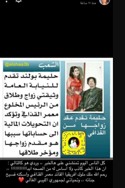 ونشرت حليمة بولند صورة من خبر عبر حسابها بسناب شات نصه" حليمة بولند تقدم وثيقتي زواج وطلاق من الرئيس المخلوع معمر القذافي وتؤكد أن المالية إلى حساباتها سببها هو مقدم زواجها وموخر طلاقها".