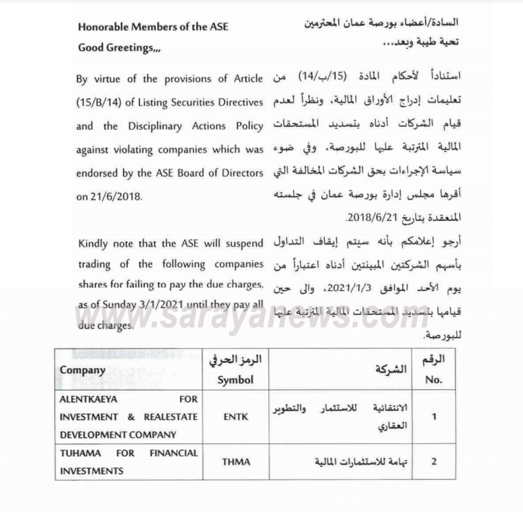 و أظهر كتاب التعميم الصادر عن مجلس ادارة بورصة عمان و الذي حصلت عليه سرايا، قرار مجلس الادارة بوقف التداول بأسهم الشركتين المذكورتين اعتباراً من أمس الأحد الموافق 3/1/2020 وذلك استناداً لأحكام المادة 15/ب/14 من تعليمات ادراج الاوراق المالية.