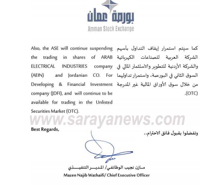 كما قرر مجلس ادارة بورصة عمان الاستمرار بإيقاف التداول بأسهم شركتي "العربية للصناعات الكهربائية و الشركة الأردنية للتطوير والاستثمار المالي"، والاستمرار بتداول أسهمها بسوق الاوراق المالية غير المدرجة.