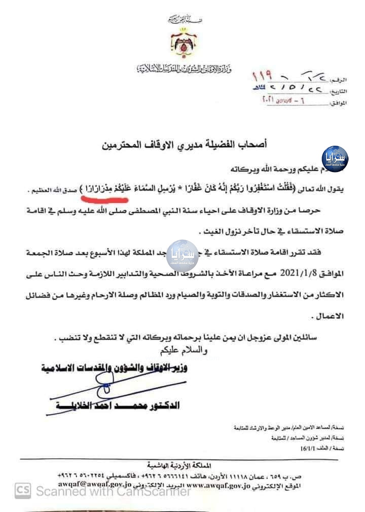 سرايا - تداول ناشطون على مواقع التواصل الاجتماعي صورة لكتاب وزير الاوقاف محمد الخلايلة الذي عممه على مديريات الأوقاف لآداء صلاة الإستسقاء الجمعة المقبل وقد ورد به خطأ إملائي في كاتبة الآية القرآنية "ويُرسلُ السماء عليكم مدرارا".