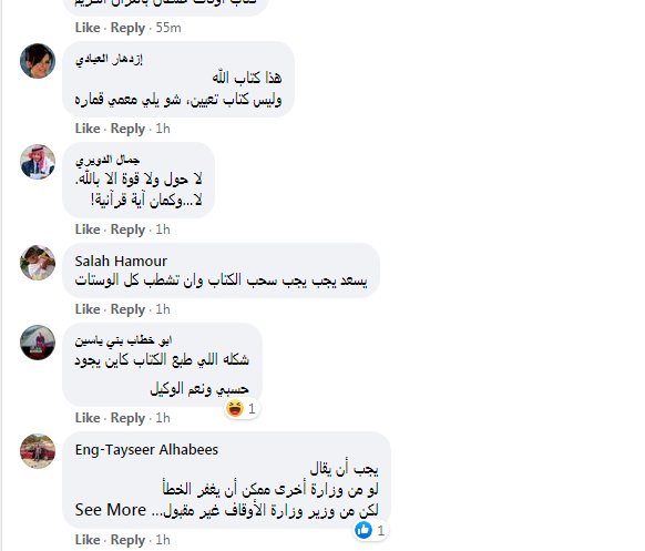 ودعا الناشطون وزير الاوقاف لسحب الكتاب من مديريات الأوقاف و إعادة كتابته بالشكل الصحيح، إكراماً لكتاب الله.
