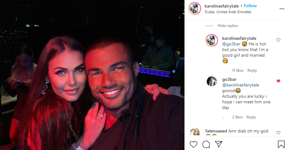 وقد سألها أحد متابعيها على حسابها بموقع "انستجرام"، قائلا :"نحن نظن أن هناك علاقة عاطفية تجمعك بعمرو دياب"، فردت عليه قائلة: "أنا أعلم أنه جذاب، ولكن أنا فتاة جيدة ومتزوجة".