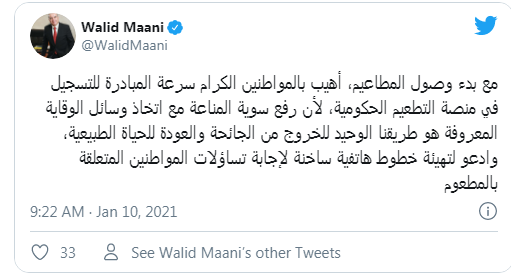 سرايا - وجه وزير التعليم العالي الأسبق الطبيب وليد المعاني رسالة للأردنيين يدعوهم فيها للتسجيل بمنصة تلقي لقاح كورونا، وذلك بعد بدء وصول اللقاحات الى المملكة.