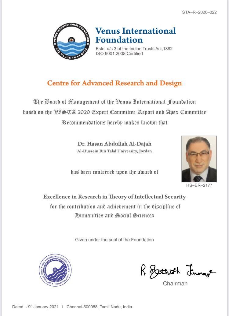سرايا - لقد تم منح الباحث الدكتور حسن عبدالله الدعجه الأستاذ المشارك في قسم الاعلام والدراسات الإستراتيجية بجامعة الحسين بن طلال جائزة "التميز" لـ: نظرية الأمن الفكري للمساهمة في اثراء تخصص العلوم الإنسانية والاجتماعية على مستوى العالم.