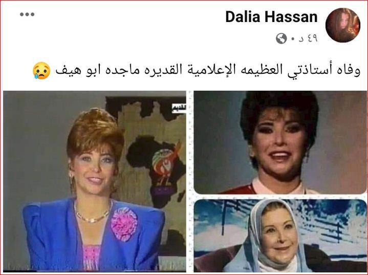 سرايا - أعلنت الإعلامية مها موسى وفاة المذيعة بالتليفزيون المصري الإعلامية ماجدة أبو هيف.