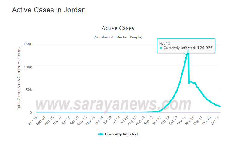 سرايا - كشف موقع "وورد ميتر" المختص في رصد إحصائيات وباء كورونا، وجود 13 ألفا و346 إصابة كورونا نشطة في المملكة، حتى صباح اليوم الخميس 14/01/2021، منها 168 في العناية الحثيثة.