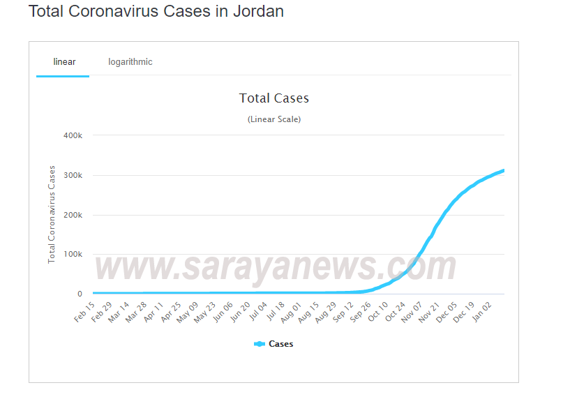 و يُشير الموقع أن عدد الإصابات المسجلة في المملكة منذ ظهور الوباء، 310 آلاف و 968 حالة، مصنفاً الأردن في المرتبة 39 عالمياً بعدد الإصابات التراكمي.