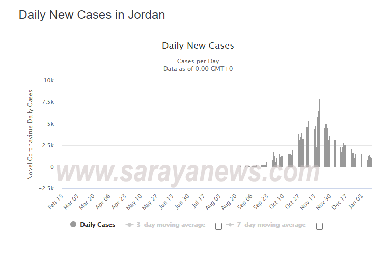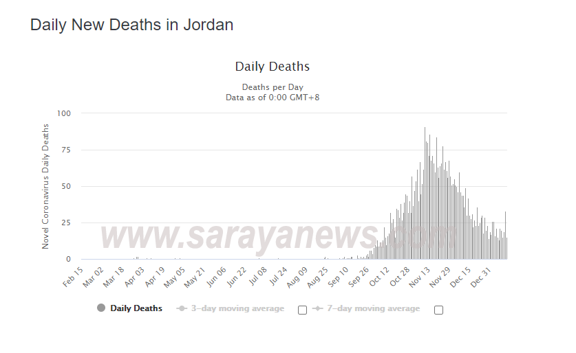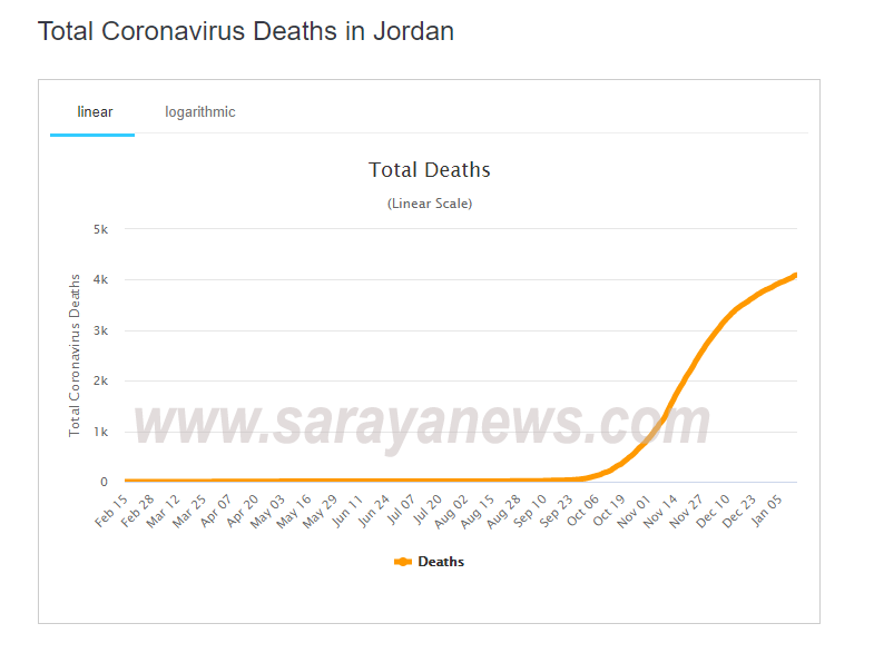 و بحسب الموقع، توفي 4091 شخصاً في الأردن جراء الفيروس، بعد إضافة تسجيل 15 حالة وفاة الأربعاء.