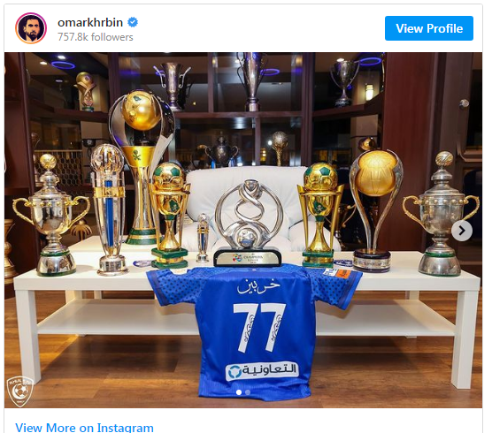 وكتب خربين، عبر حسابه الشخصي على "إنستغرام": "اليوم أودع زملائي وأخواني في نادي الهلال.. بعد سنوات مليئة بالذهب والمنجزات، تشرفت خلالها بارتداء قميص أعظم وأكبر أندية آسيا.. أتيت محبا للهلال، وأرحل عنه عاشقا".