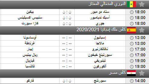 سرايا - نستعرض لكم مباريات اليوم الأحد الموافق يوم 17 من شهر يناير لعام 2021 الجاري والذي سنشاهد فيه مجموعة من المباريات في الدوري الإنجليزي الممتاز وكأس السوبر الإسباني والدوري الإيطالي والدورى الألماني والدورى المصري لكرة القدم فى موسم 2020-2021.