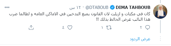 سرايا - علقت النائب السابق، الدكتورة ديمه طهبوب على صورة نشرها مراسل قناة الجزيرة القطرية في المملكة، الزميل تامر الصمادي حول ظاهرة "رماد سجائر النائب" تحت القبة.