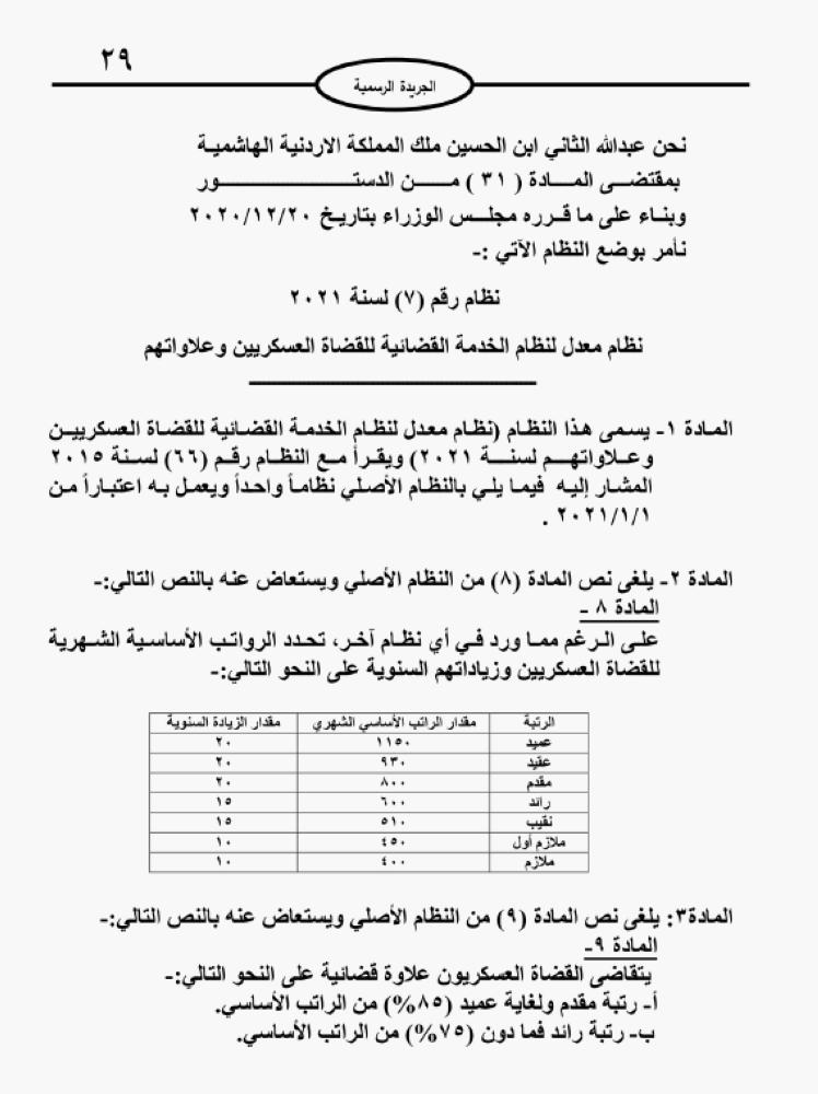 سرايا - صدرت الإرادة الملكية بنظام معدل لنظام الخدمة القضائية للقضاة العسكريين وعلاواتهم وذلك بعد نشره في الجريدة الرسمية اليوم الاحد.