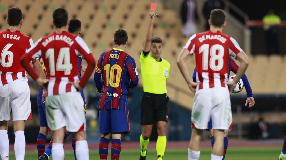 سرايا - نال الأسطورة الأرجنتينية ليونيل ميسي، أول بطاقة حمراء له مع فريق برشلونة وذلك في مواجهة فريق أتليتك بلباو، بنهائي كأس السوبر الإسباني، وهو النهائي الذي خسره فريق برشلونة، ليتعرض اللاعب الحاصل على الكرة الذهبية في 6 مرات لأول حالة طرد مع فريقه الإسباني الذي قاده إلى العديد من البطولات.