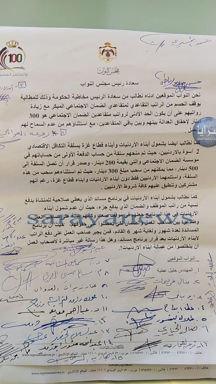 نحن النواب الموقعين ادناه نطالب من سعادة الرئيس مخاطبة الحكومة وذلك للمطالبة بوقف الحسم من الراتب التقاعدي لمتقاعدي الضمان الاجتماعي المبكر مع زيادة رواتبهم على أن يكون الحد الأدنى لرواتب متقاعدين الضمان الاجتماعي هو 300 دينار لإحقاق العدالة بينهم وبين باقي المتقاعدين، مع استثناؤهم من عدم السماح لهم بالعمل.
