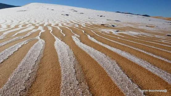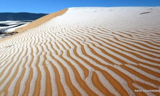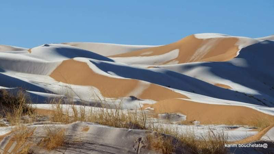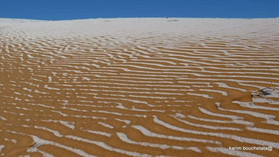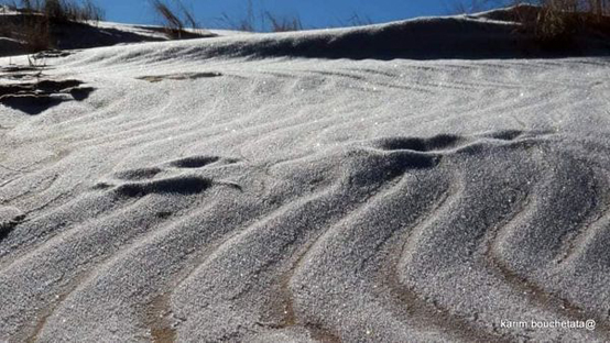 ورصدت الصور الملتقطة تناغما فريدا بين طبقة الجليد البيضاء وكثبان الرمال الصفراء، في تمازج نادرا ما يشاهد في الصحراء الكبرى.