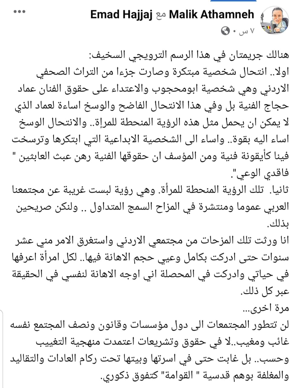 سرايا - نفى رسام الكاريكاتير الساخر عماد حجاج عبر حسابه الخاص على تويتر، صلته بالكاريكاتير الذي تم تداوله عبر مواقع التواصل الإجتماعي، والذي يجسد شخصية أو محجوب، موصفاً إياهُ بالمحتوى الساذج الذي لا يمت لأسلوبه في الرسم، ولمواقفه الواضحة .