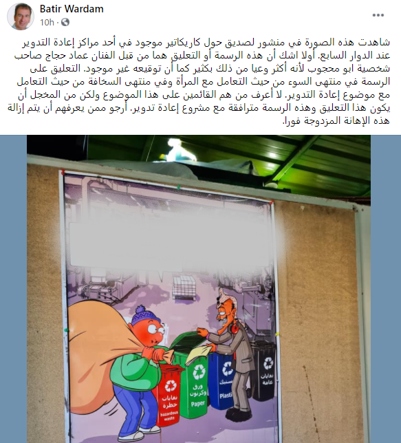 وجاء محتوى الكاريكاتير ، الذي أثار غضب نشطاء مواقع التواصل، "رجلان أحدهما يمثل شخصية أبو محجوب والآخر صديقه "أبو محمد"، وكما هو واضح في الصورة، أمامهما سِلال لإعادة تدوير النفايات، ليأتي "أبو محمد" وهو يحمل كيساً كبيراً ، ليبدأ الحوار بين الشخصيتين؛ ""ول ول .. شو هذا يا أبو محمد؟ ما اعرفتك هلقد بتحب إعادة التدوير! شو فيه هالشوال؟، ليرد أيو محمد: هاي أم محمد .. جبتها أعيد تدويرها.. بلكي رجعتلي شبه شاكيرا!".