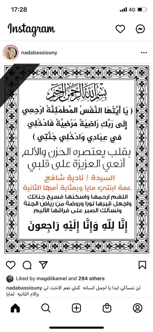 ونعت الفنانة ندى بسيوني، شقيقة سناء شافع، وكتبت عبر حسابها الشخصي بموقع تبادل الصور والفيديوهات الشهير "انستجرام":"لن ننساكى أبدا يا أجمل إنسانة.. كنتى نعم الأخت لى والأم الثانية لمايا.. مهما قلنا لن نوافيكى حقك".