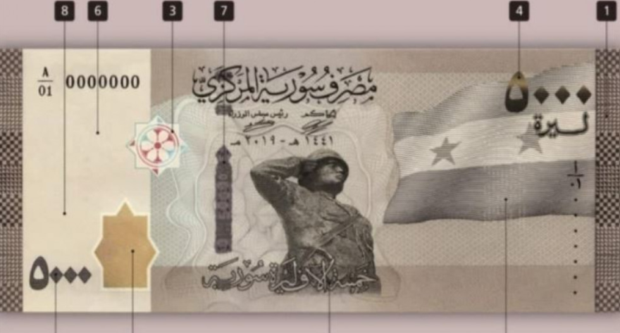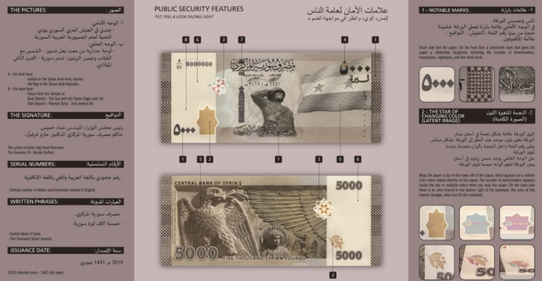 وكانت أكبر ورقة نقدية، يطبعها النظام، إثر التدهور العنيف في سعر صرف الليرة، مقابل الدولار، هي من فئة الـ 2000، وتم تداولها عام 2017، وعليها صورة رئيس النظام السوري بشار الأسد، فيما الورقة الجديدة من فئة الـ 5000 عليها، صورة لجندي أثناء أدائه تحية لعلم بدون ألوان.