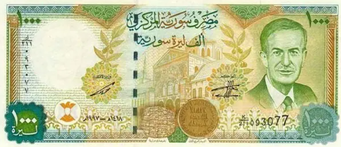 وكانت إحدى إصدارات الورقة النقدية، من فئة الألف ليرة، عليها صورة لحافظ الأسد، والد بشار، ورئيس سوريا السابق.