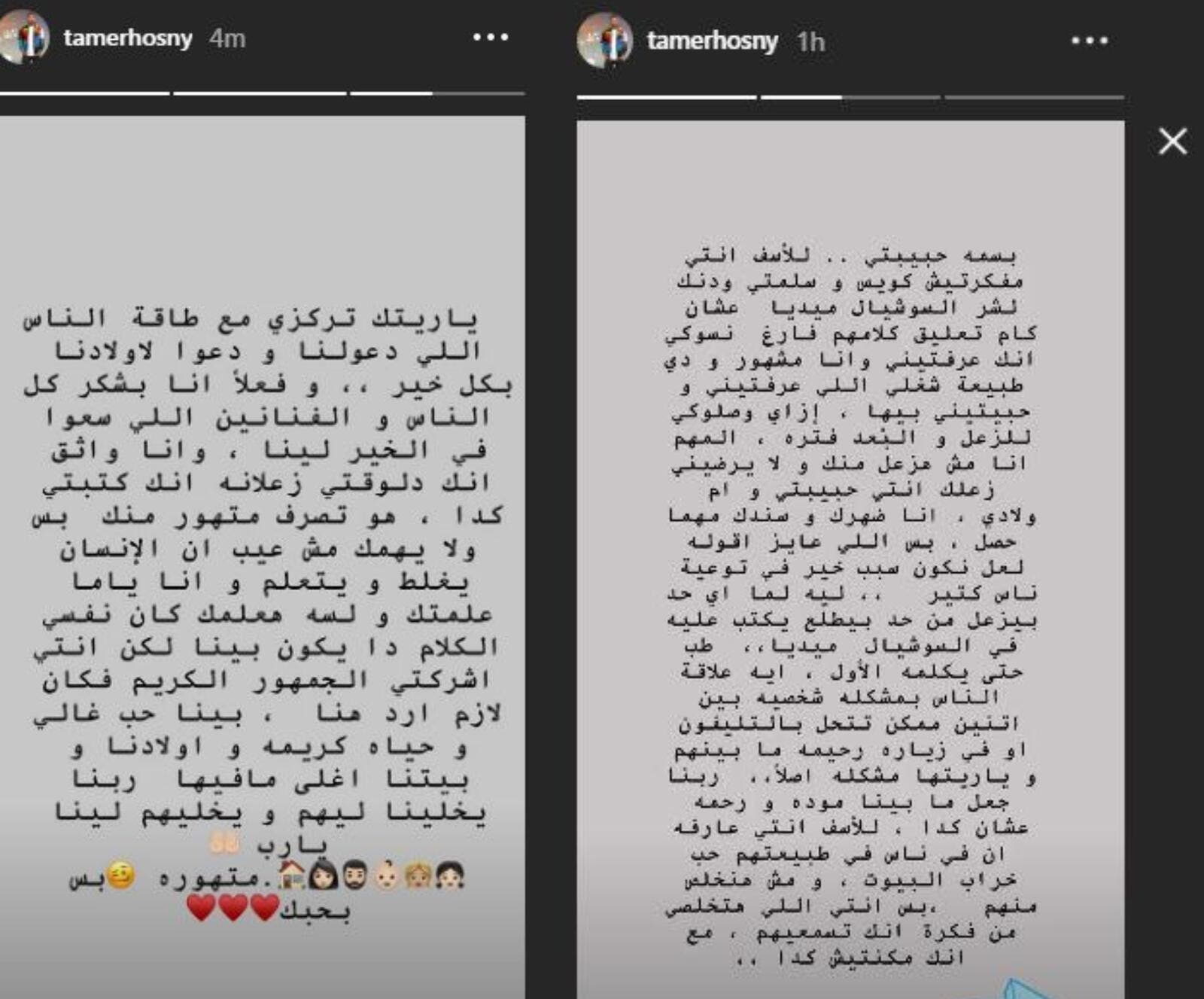 الناس والفنانين اللي سعوا في الخير لينا، وأنا واثق إنك دلوقتي زعلانة إنك كتبتي كدا، هو تصرف متهور منك، بس ولا يهمك مش عيب إن الإنسان يغلط ويتعلم، وأنا ياما علمتك ولسه هعلمك، كان نفسي الكلام دا يكون بينا، لكن أنت أشركتي الجمهور الكريم، فكان لازم أرد هنا بينا حب غالي وحياة كريمة وأولادنا، وبينا أغلى ما فيها، ربنا يخلينا ليهم ويخليهم لينا يا رب. متهورة بس بحبك".