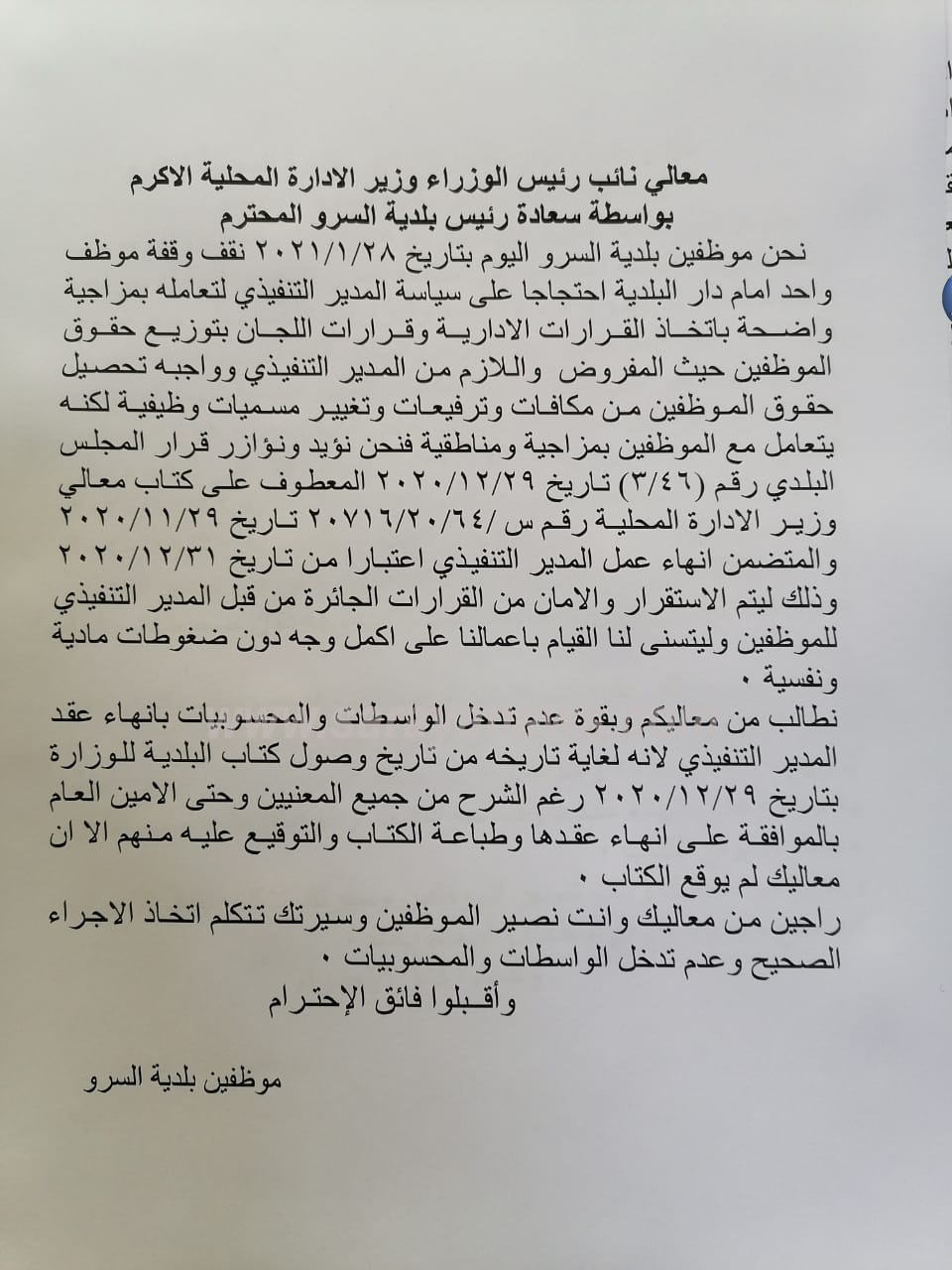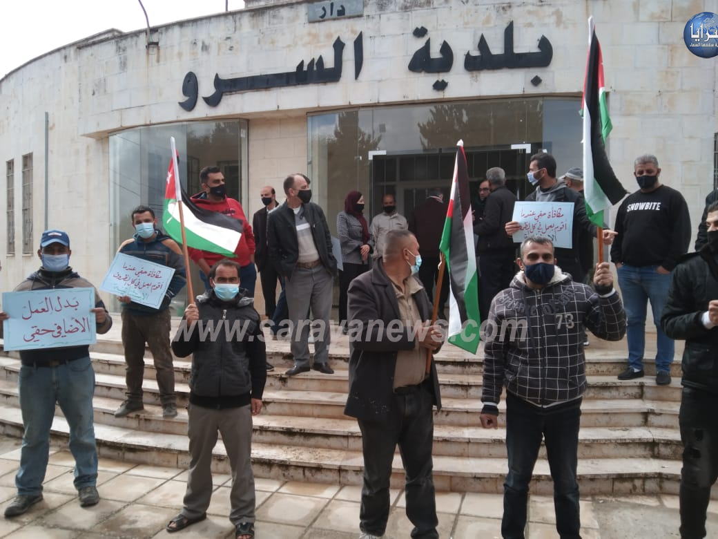 سرايا - اربد - يوسف قطيش - نفذ العشرات ظهر الخميس من موظفي بلدية السرو في لواء بني كنانه شمال مدينة اربد وقفة احتجاجية أمام مبنى البلدية وذالك احتجاجاً على عدم صرف المستحقات المالية والمكافات.