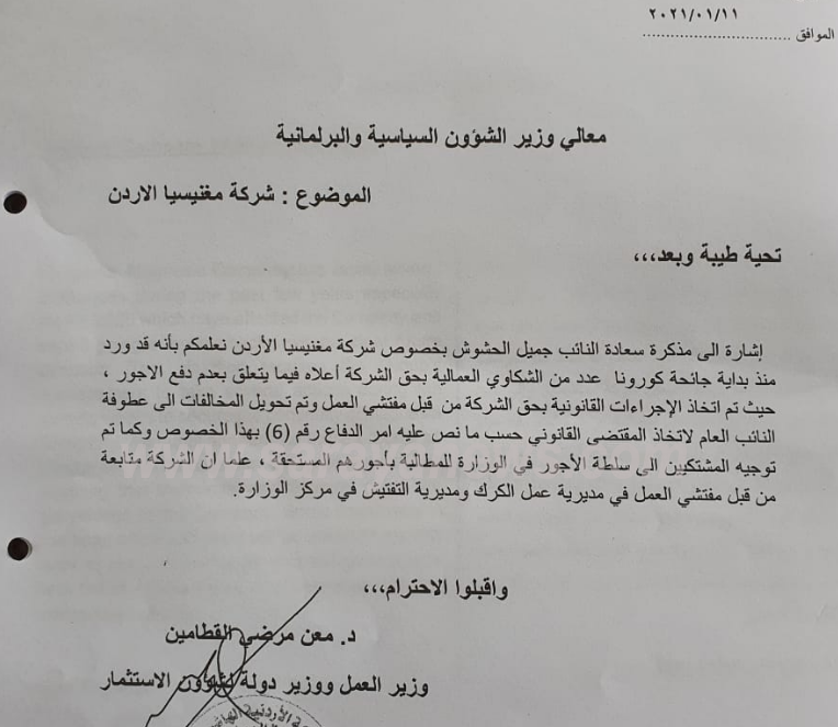 وخاطب وزير العمل معن القطامين وفق كتاب وصل سرايا، النائب جميل الحشوش، الذي أكد انه تم اتخاذ الاجراءات القانونية بحق الشركة وتم تحويل المخالفات الى النائب العام لاتخاذ الاجراء القانوني بما ينص عليه امر الدفاع رقم 6 وتم توجيه المشتكين الى سلطة الاجور في الوزارة للمطالبة بدفع أجورهم.