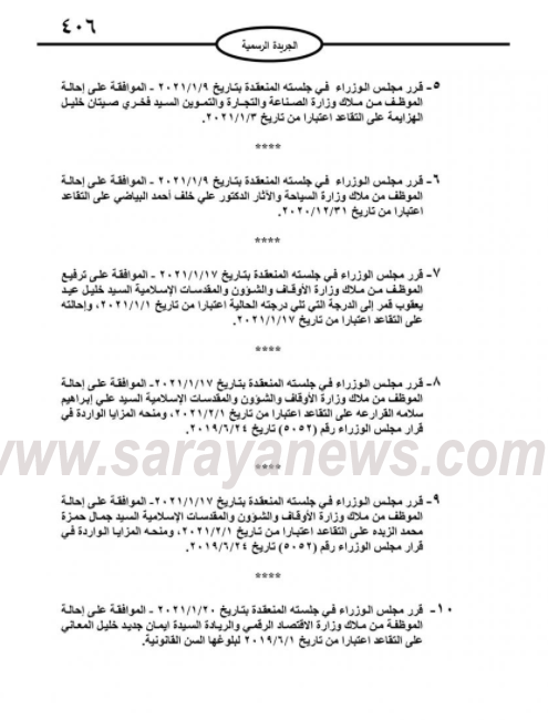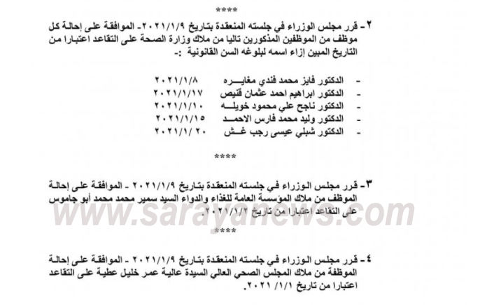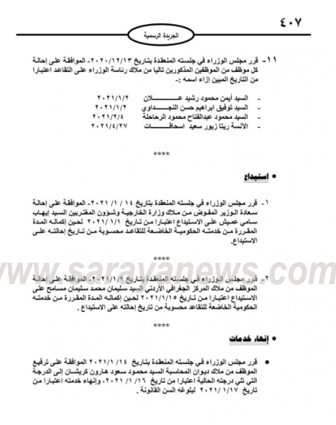 سرايا - صدر في عدد الجريدة الرسمية اليوم الاثنين، قرارات مجلس الوزراء باحالة عدد من موظفي الدولة الى التقاعد، واحالة اخرين الى الاستيداع، وانهاء خدمات.وتاليا الاسماء: