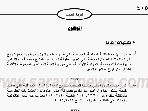 سرايا - قرر مجلس الوزراء في جلسته المنعقدة بتاريخ 17/1/2021 الموافقة على تمديد خدمة الدكتور حازم ابراهيم عبدالكريم الخصاونة مدير عام دائرة المشتريات الحكومية بالوكالة للفترة من 10/12/2020 وحتى 20/1/2020 بعد بلوغه السن القانونية، و إحالته الى التقاعد اعتباراً من تاريخ 21/1/2021.
