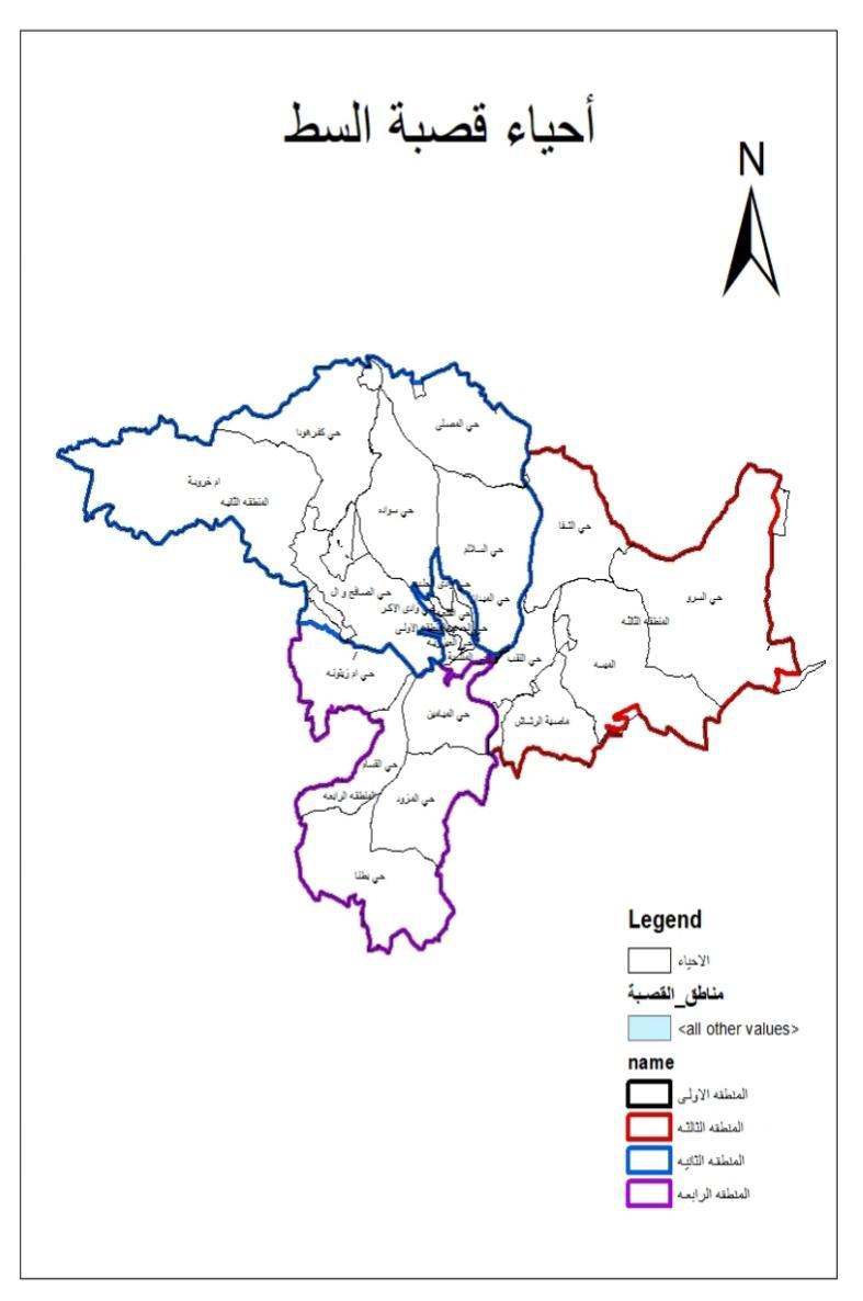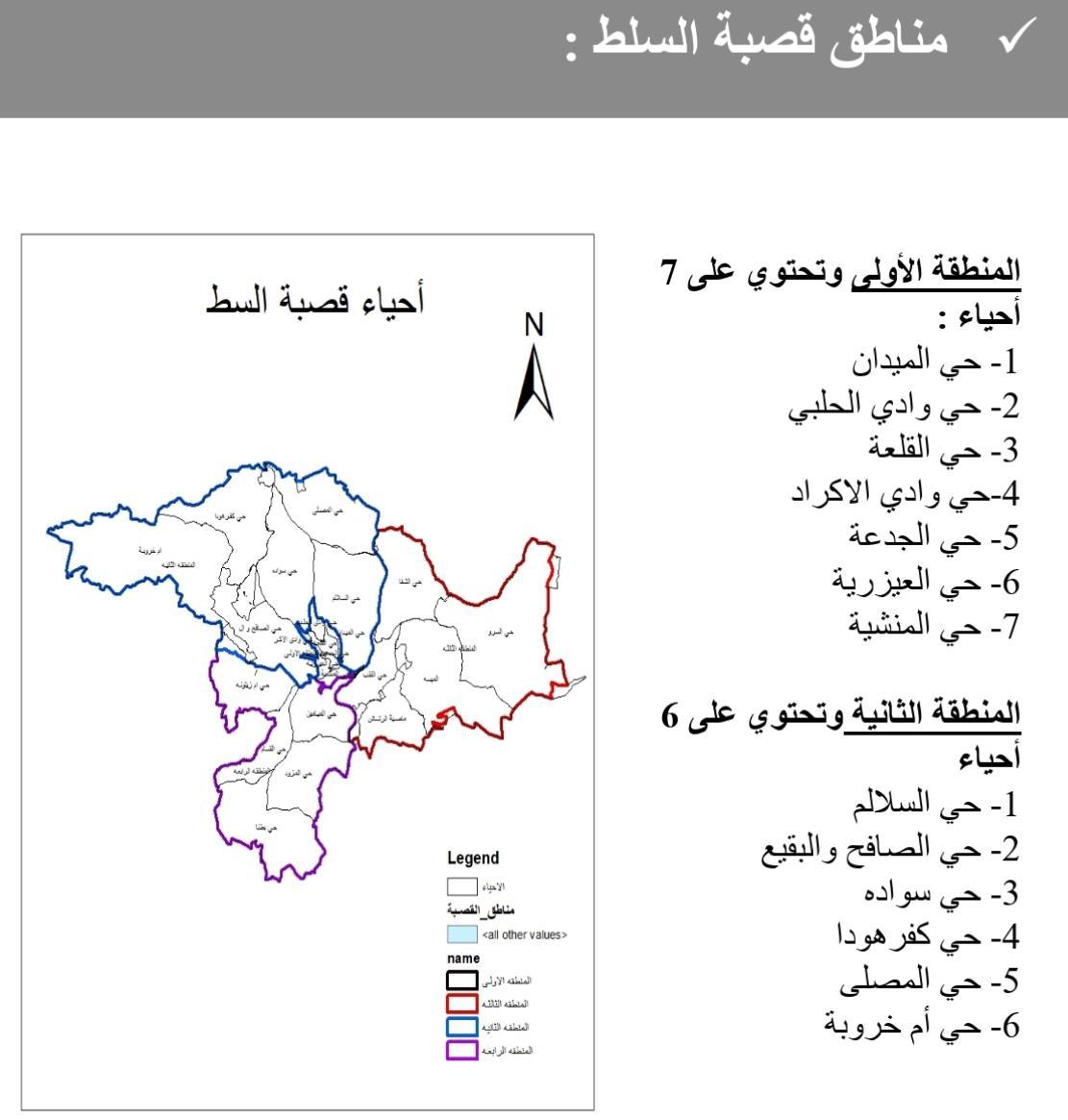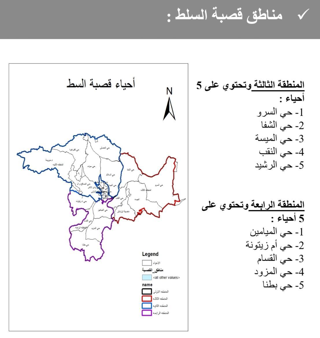 و قال الخشمان لقد تم تقسيم قصبة السلط إلى أربعة مناطق و كل منطقة تحتوي على عدة أحياء على النحو التالي: