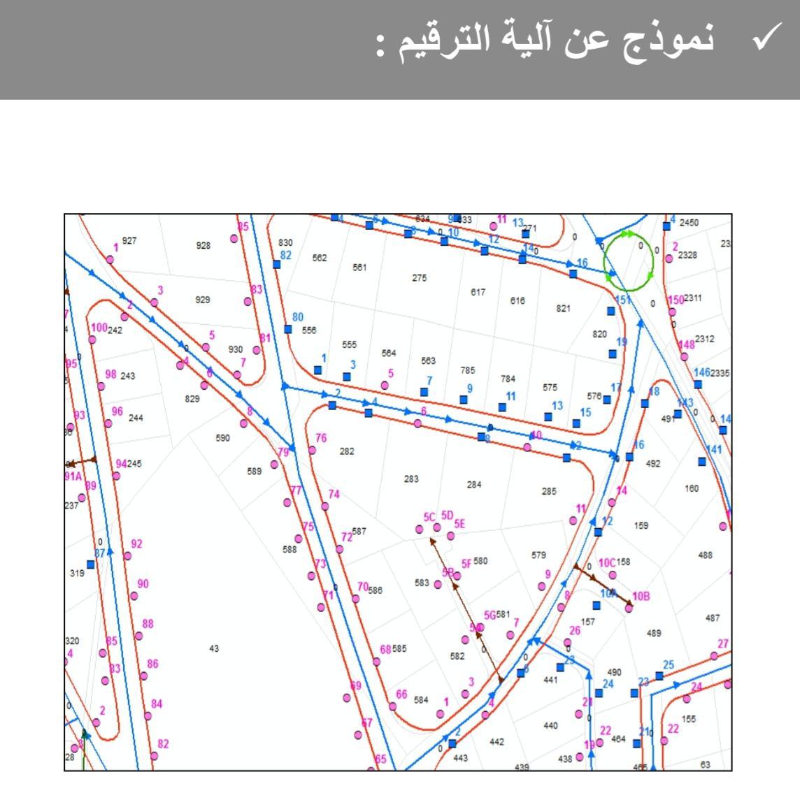 ترقيم قطع الأراضي على امتداد الشوارع من اليمين ترقيم زوجي و من اليسار ترقيم فردي و إتجاه الترقيم لبداية الشارع بدلالة إتجاه السهم المشار إليه على لوحة الجداريات