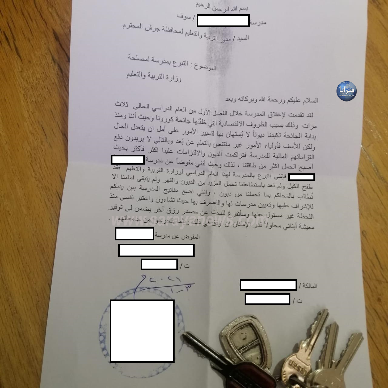 سرايا - ايمن العمري - سلمت احدى المدارس الخاصة في محافظة جرش مفاتيح المدرسة الى مديرية التربية والتعليم في المحافظة، بعد أن عجزت المدرسة مالياً عن الالتزام بسداد المستحقات المترتبة عليها، بعد رفض الأهالي دفع الأقساط بسبب التعليم عن بعد.