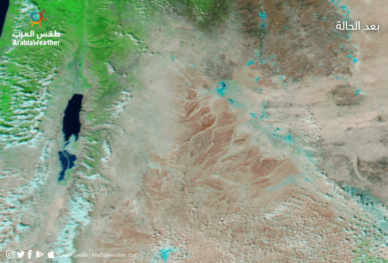 حيثُ توضح الصور انتشار البرك المائية والبحيرات الصغيرة والسيول على طول المناطق الشرقية من المملكة.