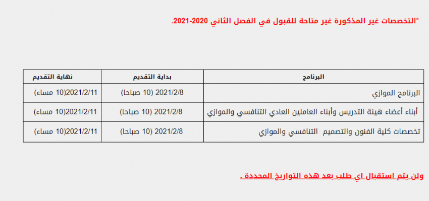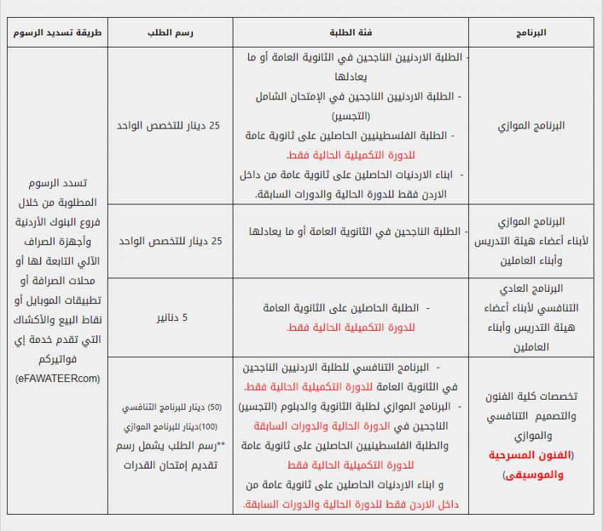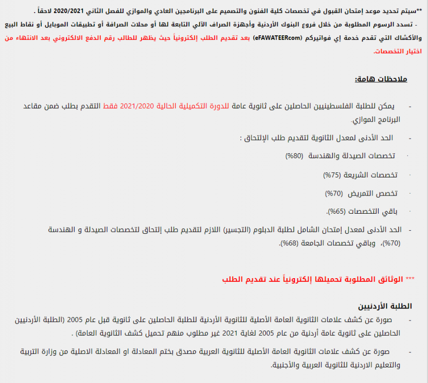 سرايا - أعلن المسجل العام في الجامعة الأردنية الدكتور أشرف العدوان عن البدء بإستقبال طلبات الالتحاق للجامعة لدرجة البكالوريوس للطلبة الناجحين في الثانوية العامة وطلبة الدبلوم (التجسير) في البرامج والتخصصات التالية: