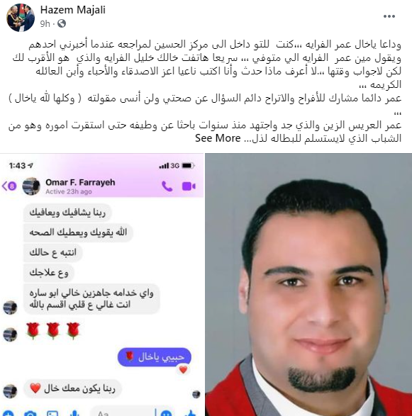 سرايا - نعى النائب حازم المجالي بكلماتِ مؤثرة و مبكية رحيل الشاب عمر الفراية، الذي وافته المنية أمس الإثنين إثر جلطة على الرئة، و تالياً ما كتبه المجالي، فالسطور لا تكفي لشرحه: