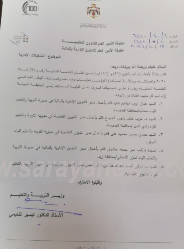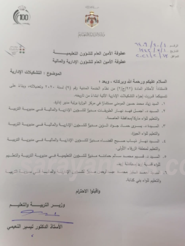 سرايا - أجرى وزير التربية و التعليم، الدكتور تيسير النعيمي، سلسلة من التنقلات و التشكيلات الإدارية لكبار موظفي الوزارة.