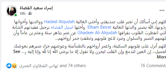 الفتاة غدير القضاة تزوجت منذ فترة ليست بالبعيدة وقد كانت تحمل في بطنها مولودها التي تنتظره، إلا أن إرادة الله بأن تكون بجاوره حالت دون ذلك، وقد سبب رحيلها حزناً في نفوس المقربين منها.