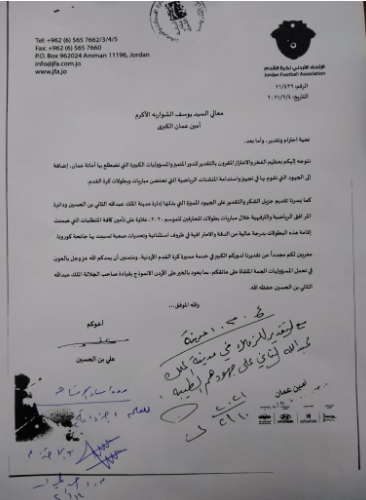 سرايا - وجه سمو الأمير علي بن الحسين، رئيس الاتحاد الأردني لكرة القدم، شكره لمدينة الملك عبد الله الثاني الرياضية بالقويسمة.