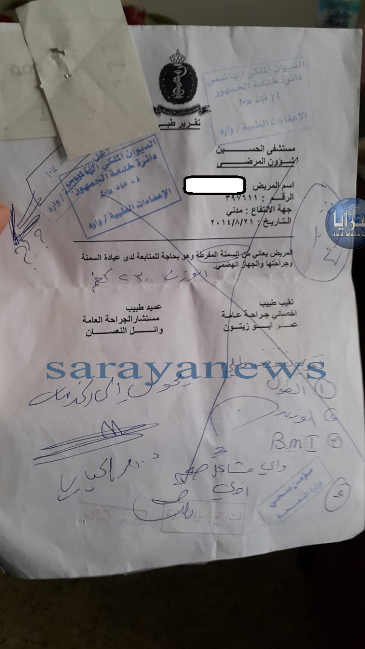 سرايا - ناشد مواطن يشرف على الموت، بسبب وزنه الزائد الذي تجاوز الـ 245 كيلو غراما، الديوان الملكي الهاشمي؛ لتغطية عمليتيه، إزالة الدهون ثم قص المعدة، والتي تتراوح تكلفتها بين الـ 6 إلى 8 آلاف دينار .