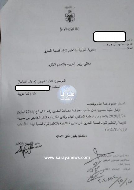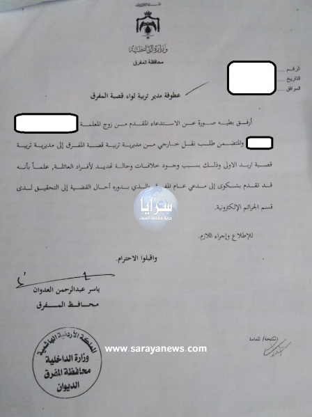 وكان قد بعث محافظ المفرق بكتاب إلى مديرية تربية المفرق، طلب فيها الموافقة على نقلها ، تبعا لوجود خلافات وحالة تهديد لأفراد العائلة، علما أنها تقدمت بشكوى إلى مدعي عام المفرق والذي بدوره أحال القضية لدى قسم الجرائم الإلكترونية.