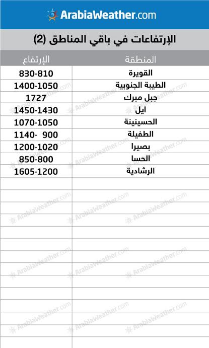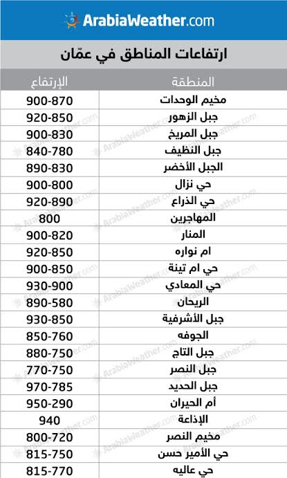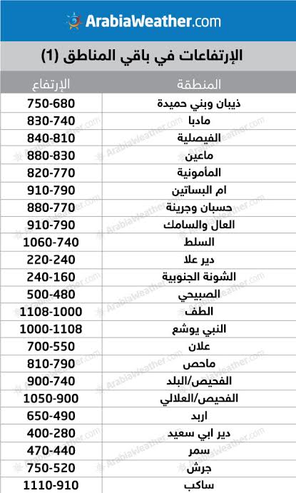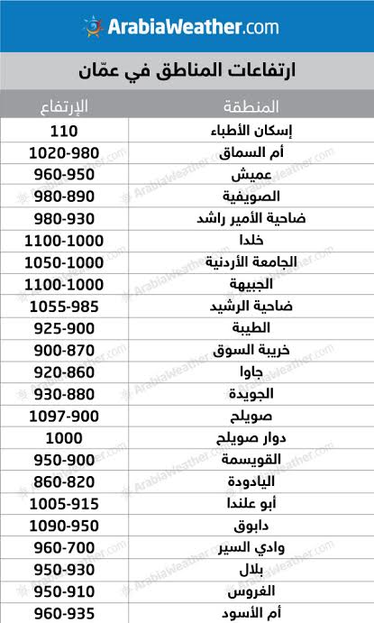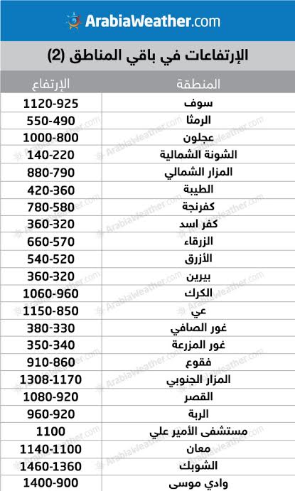 ونشر موقع "طقس العرب" قائمة بارتفاعات المناطق الأردنية عن سطح البحر، وهي على النحو التالي:
