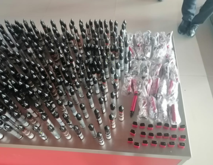 ومن جهة أخرى تم ضبط نكهات سجائر الكترونية بعدد (605) عبوة و(26) سيجارة الكترونية بالإضافة إلى (20) رأس سيجارة الكترونية كانت مخبأة ضمن حقيبة لمسافر قادم الى مطار الملك حسين الدولي-العقبة.